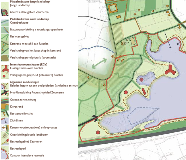 Voor de recreatieplas is een zonering opgesteld, die aansluit bij het landschapspatroon en bij de ambitie om een luwe kant aan de recreatieplas te behouden. Nieuwe functies op het recreatieterrein (de eerder genoemde intensivering van het recreatieterrein) zijn mogelijk in het westelijke deel van het terrein dat in het oude landschap ligt of er net aan grenst (binnen contour intensieve recreatie). De andere zijde van de recreatieplas blijft een luwe zone met een groene en natuurlijke uitstraling en extensieve vormen van recreatief medegebruik (wandelpad). De maat van de functies is mede bepalend voor de uitstraling van het gebied. Zij moeten passen binnen de schaal van het in te zetten landschapspatroon.