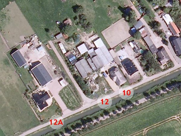 Luchtfoto van het plangebied. Op Bulkheuvelseweg 12 zal de nieuwe burgerwoning gebouwd worden. Bron: Risicokaart Gelderland.