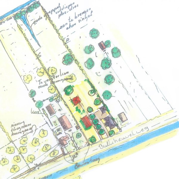 - 5 hoogstamfruitbomen ter versterking van de bestaande boomgaard met een oppervlakte van 50 m² per boom (kroonoppervlak van 10 m² per boom)