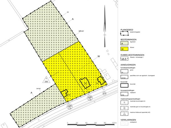 Om het bouwprogramma te realiseren zijn er in de verbeelding de bestemmingen Wonen en Agrarisch opgenomen, met als dubbelbestemming Waarde - Archeologie 1, verder drie bouwvlakken met maatvoeringen voor de woningen. Om het vereveningsplan te realiseren ligt op de bestemming Agrarisch aan de westkant van het plangebied de aanduiding specifieke vorm van agrarisch - boomgaard en aan de noordkant van het plangebied de aanduiding groen.