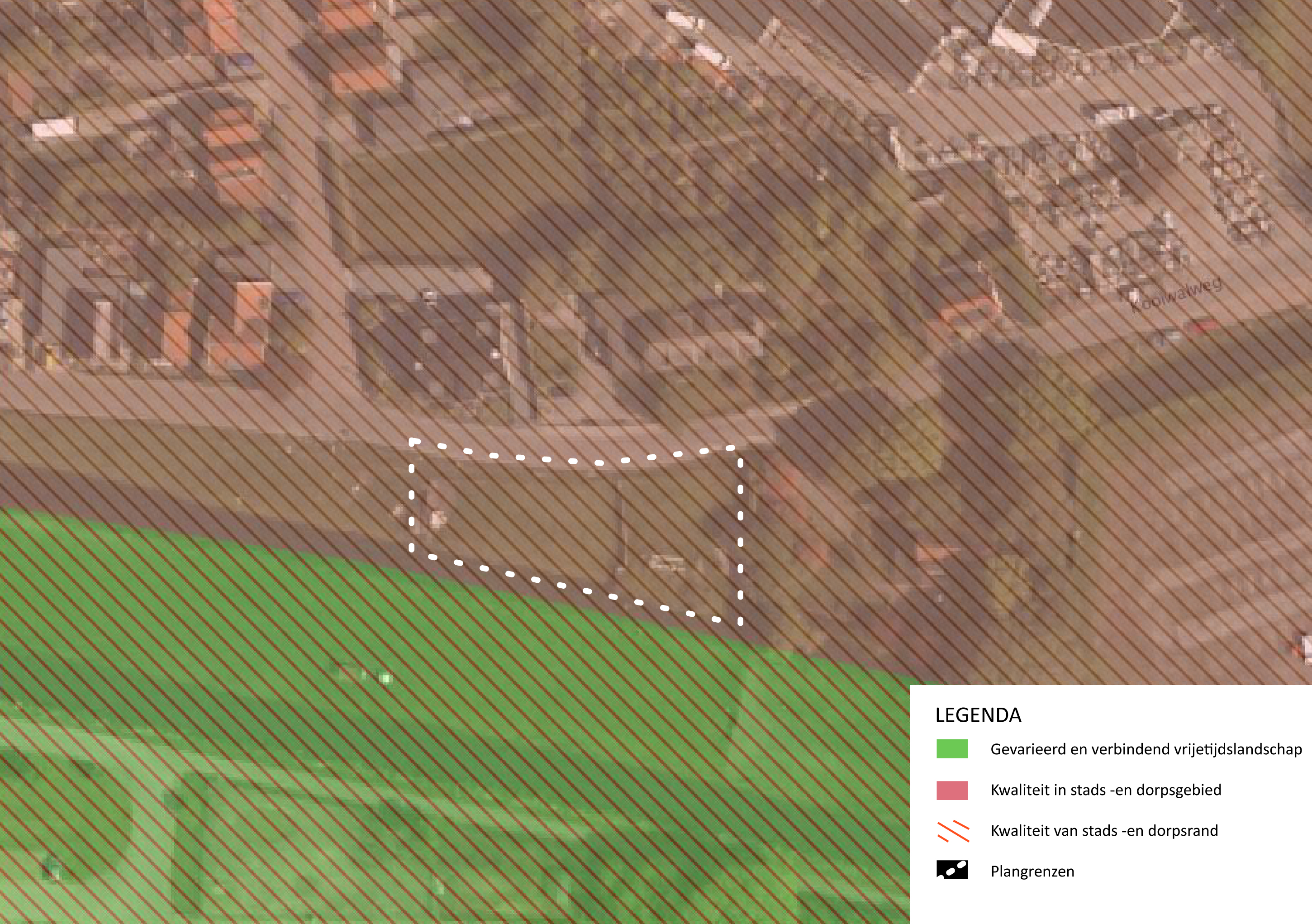 Op de kwaliteitskaart ligt het plangebied in een gebied aangewezen als ‘kwaliteit in stads- en dorpsgebied’ en ‘kwaliteit van stads- en dorpsrand’. Daarnaast grenst het plangebied aan een gebied aangewezen als 'gevarieerd en verbindend vrijetijdslandschap'. In navolgende tekst wordt op de karakteristieken van deze gebieden ingegaan. De voorgenomen ontwikkeling doet geen afbreuk aan deze karakteristieken, maar versterkt juist de ruimtelijke structuur van de lintbebouwing aan de kooiwalweg.