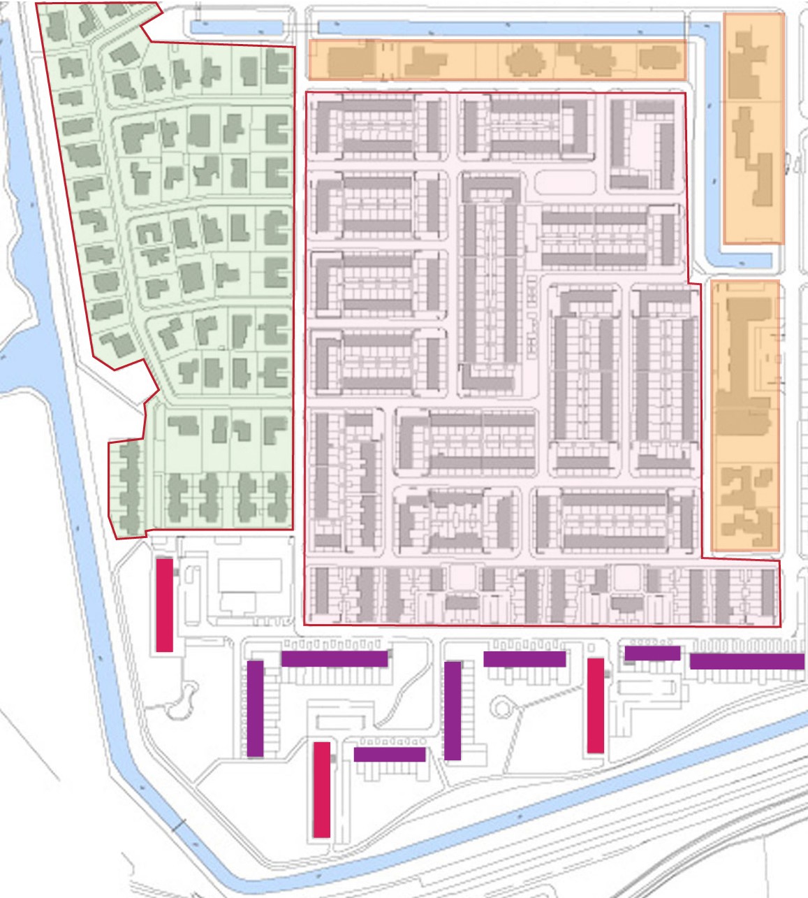 De buurten worden van elkaar gescheiden door groene buffers. Zowel de waterstructuur als de bebouwing kent een orthogonale (rechthoekige) opzet. Op straatniveau is de inrichting stenig te noemen.