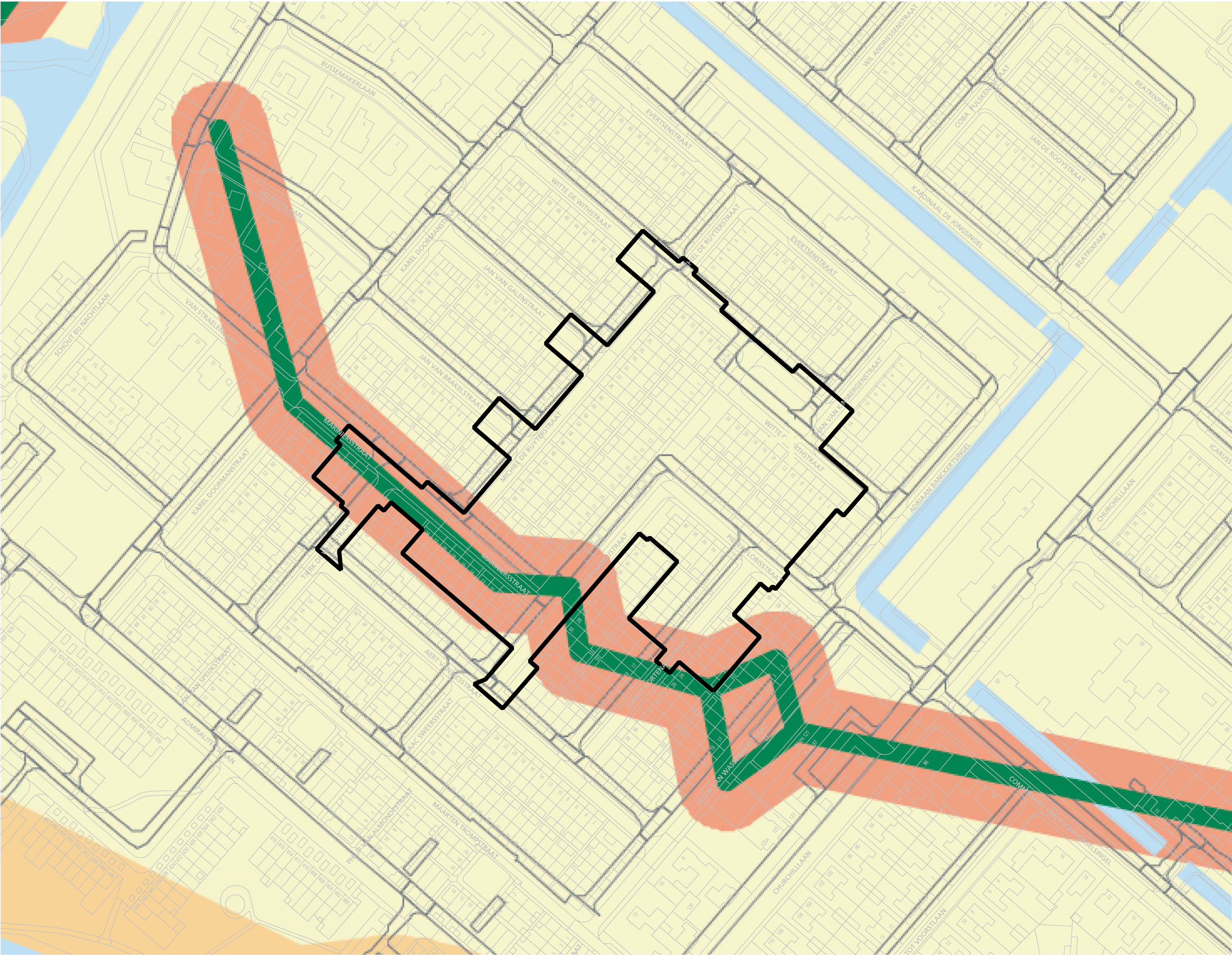 Op de archeologische waarden- en verwachtingskaart van de gemeente 's-Hertogenbosch valt het projectgebied grotendeels in een zone met een lage archeologische verwachting. Aan de zuidwestkant van het projectgebied is echter nog wel een smalle zone met een hoge archeologische verwachting zichtbaar. Afbeelding 7 betreft een uitsnede van de archeologische verwachtingskaart, waarop met een zwarte lijn de begrenzing van het projectgebied is ingetekend. De groene lijn geeft de ligging van de verdedigingslinie uit 1629 weer. De oranje zone daar omheen is een bufferzone waarbinnen de linie wordt verwacht.