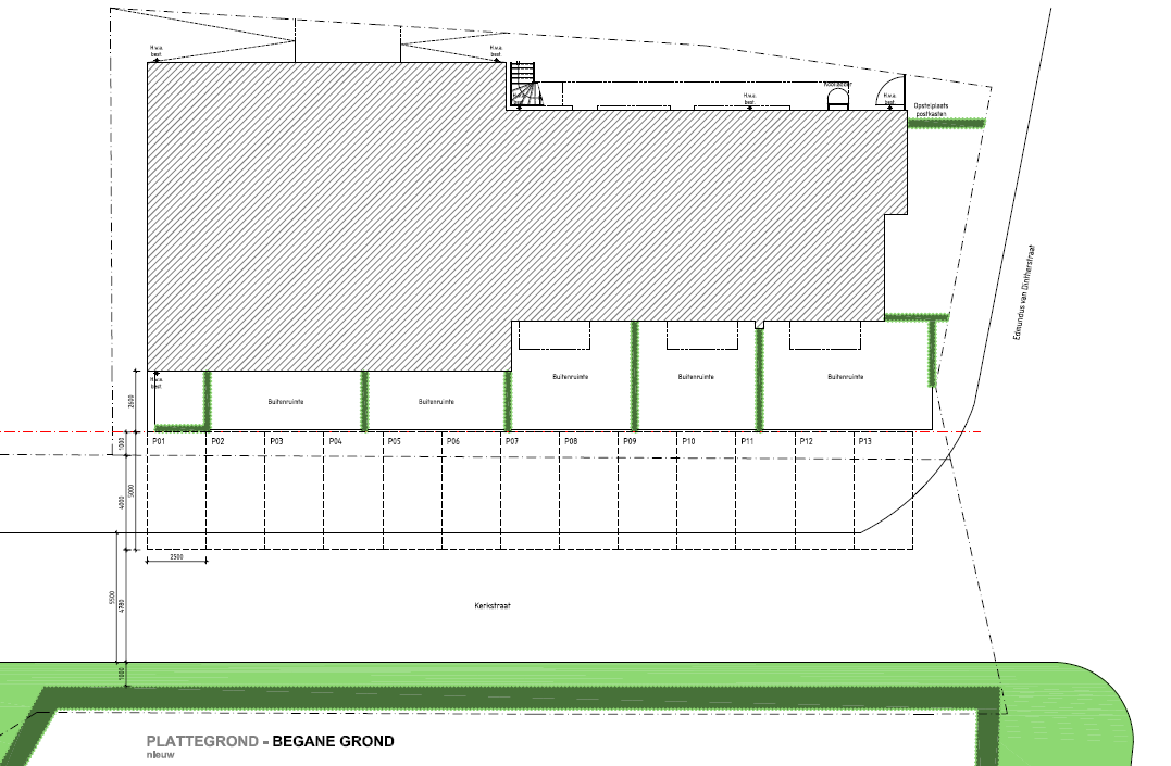 Aansluitend aan de buitenruimten worden 13 parkeerplaatsen gerealiseerd van elk 2,5m breed.
