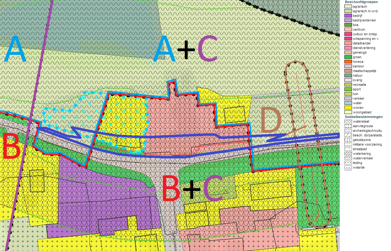 Figuur 1.2 maakt één en ander inzichtelijk. De dikke donkerpaarse lijn betreft de plangrens van onderhavig plan. Te zien is dat deze naadloos aansluit op de omliggende verkeersbestemmingen. De letters 'A', 'B', 'C' en 'D' met respectievelijk de bijhorende blauwe grens, rode grens, paarse grens en bruine grens refereren aan de opsomming hierboven. De genoemde grenzen betreffen de bestemmingsplangrenzen. De plannen 'A' en 'B' sluiten naadloos op elkaar aan en worden deels overlapt door de plannen 'C' en 'D'.