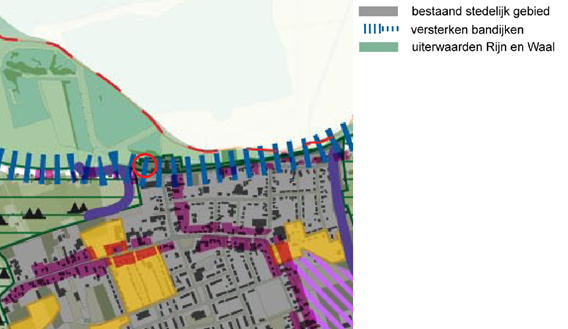 In de figuur ligt links van de dijk de kern Opheusden en rechts het opgehoogde maaiveld ten noorden van de dijk. Verder naar rechts, buiten de figuur, stroomt de Neder-Rijn. Slechts een deel van de toekomstige dijk valt binnen onderhavig plangebied. Dit betreft het deel tussen de paarse bolletjeslijnen in figuur 2.4.