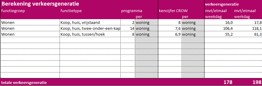 De verkeersgeneratie is berekend op basis van de gemiddelde kentallen die afkomstig zijn van het CROW (Publicatie 381 Toekomstbestendig parkeren). Voor de verkeersgeneratie dient rekening gehouden te worden met de categorieën 'Koop, huis, vrijstaand', 'Koop,huis, tussen/hoek' en 'Koop, huis, twee-onder-een-kap'. De locatie ligt in 'rest bebouwde kom' in een 'matig stedelijke' gemeente. Op basis van de genoemde kenmerken geldt een verkeersgeneratie tussen de 6,9 en de 8 mvt/etmaal.