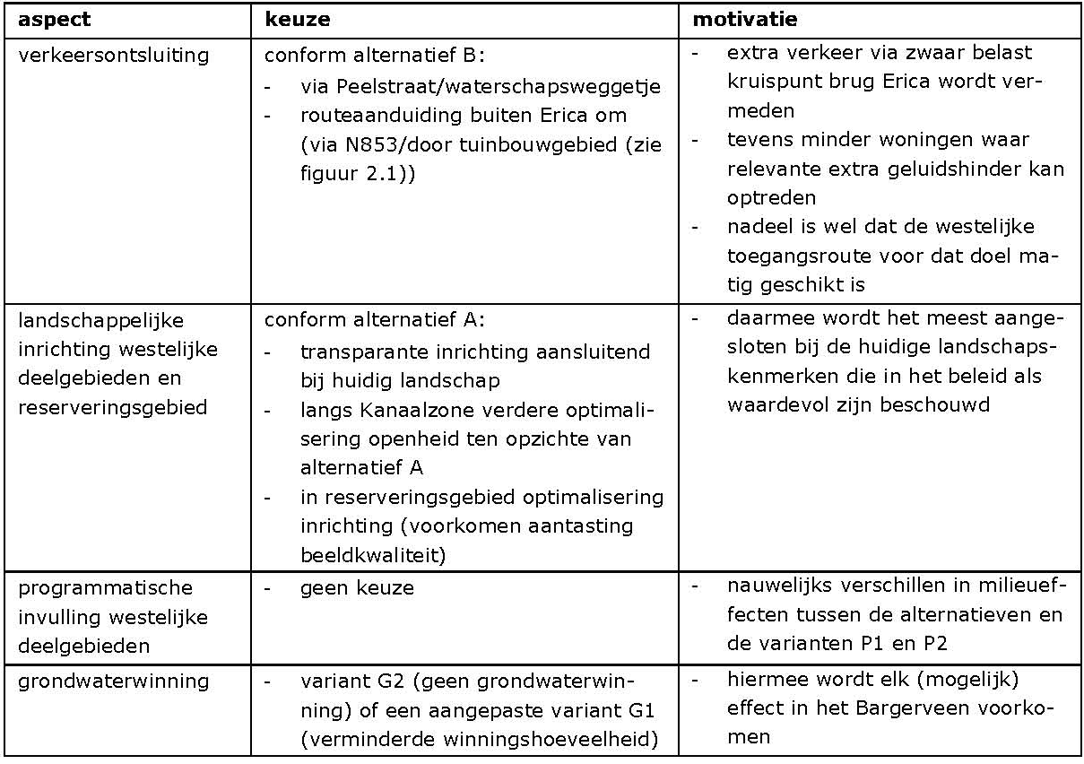 Op grond van de effectvergelijking voor de genoemde aspecten zijn de hoofduitgangspunten van het meest milieuvriendelijke alternatief (MMA) gekozen. De onderstaande tabel geeft een overzicht van deze keuzes en van de achterliggende motivatie.
