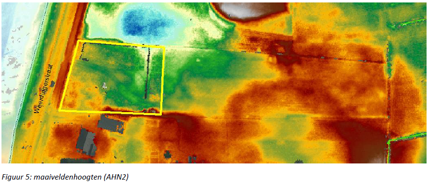 Onder het bouwperceel komen sterk fluctuerende grondwaterstanden voor (figuur 2 en 3); tussen de 0,3 en 9,4 m-mv. Dit kan worden verklaard doordat de ondergrond van het plangebied bestaat uit een goed doorlatende podzolgrond (zand) waaronder op ca. 0,8 m-mv keileem voorkomt tot dikten van 2,5 meter (figuur 4). Hierdoor kan het voorkomen dat hemelwater niet of onvoldoende in de diepere ondergrond kan infiltreren, waardoor er in en juist onder het maaiveld schijngrondwaterspiegels kunnen voorkomen op het perceel. Om na te gaan of eventuele wateroverlast door hoge grondwaterstanden boven de keileem voorkomen, kan bijvoorbeeld bij naaste buren worden nagegaan of dit inderdaad aan de orde is. Voor het bouwperceel zal het vloerpeil eveneens afgestemd moeten worden op die van de omgeving. Dat betekent voor het bouwperceel een ophoging van het maaiveld.