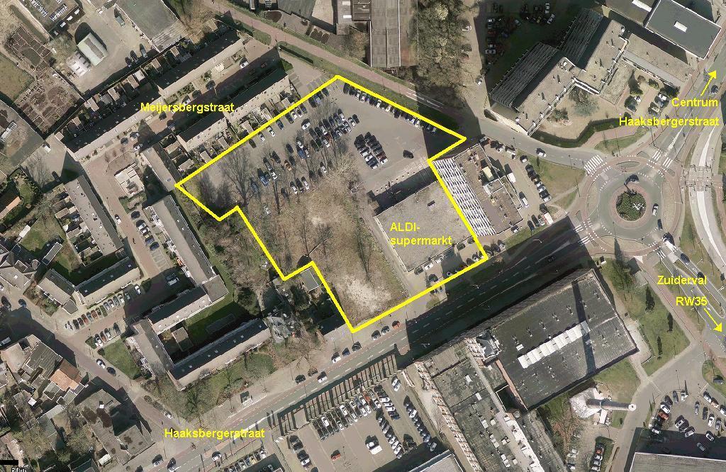 Het perceel van de bestaande supermarkt aan de Haaksbergerstraat, nabij de rotonde met de Zuiderval, beslaat in de toekomstige situatie een oppervlakte van ca. 8.250 m2, die nagenoeg in zijn geheel door bebouwing en parkvoorzieningen zal zijn verhard.