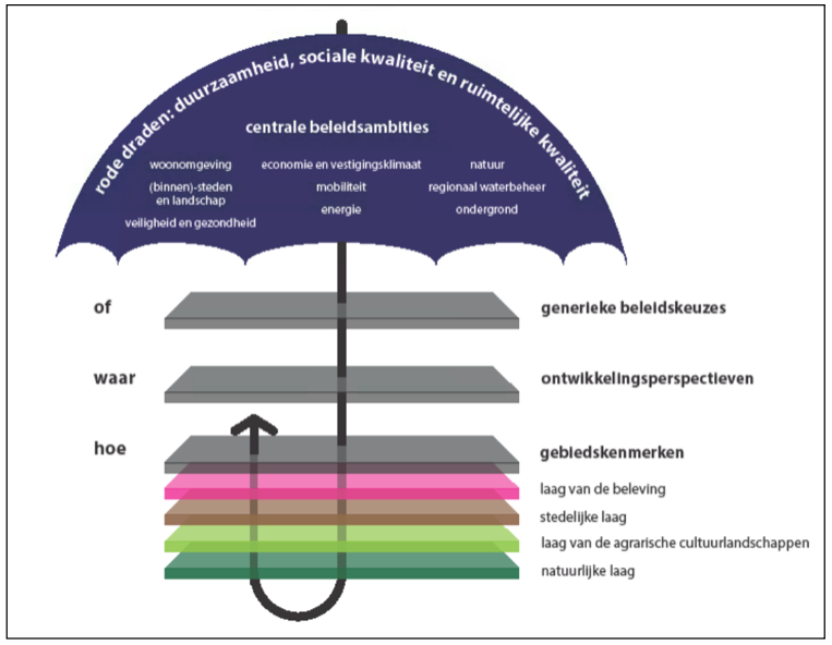 Op basis van gebiedskenmerken in vier lagen (natuurlijke laag, laag van het agrarisch cultuurlandschap, stedelijke laag en laag van de beleving) gelden specifieke kwaliteitsvoorwaarden en –opgaven voor ruimtelijke ontwikkelingen. Het is de vraag 'hoe' een ontwikkeling invulling krijgt.