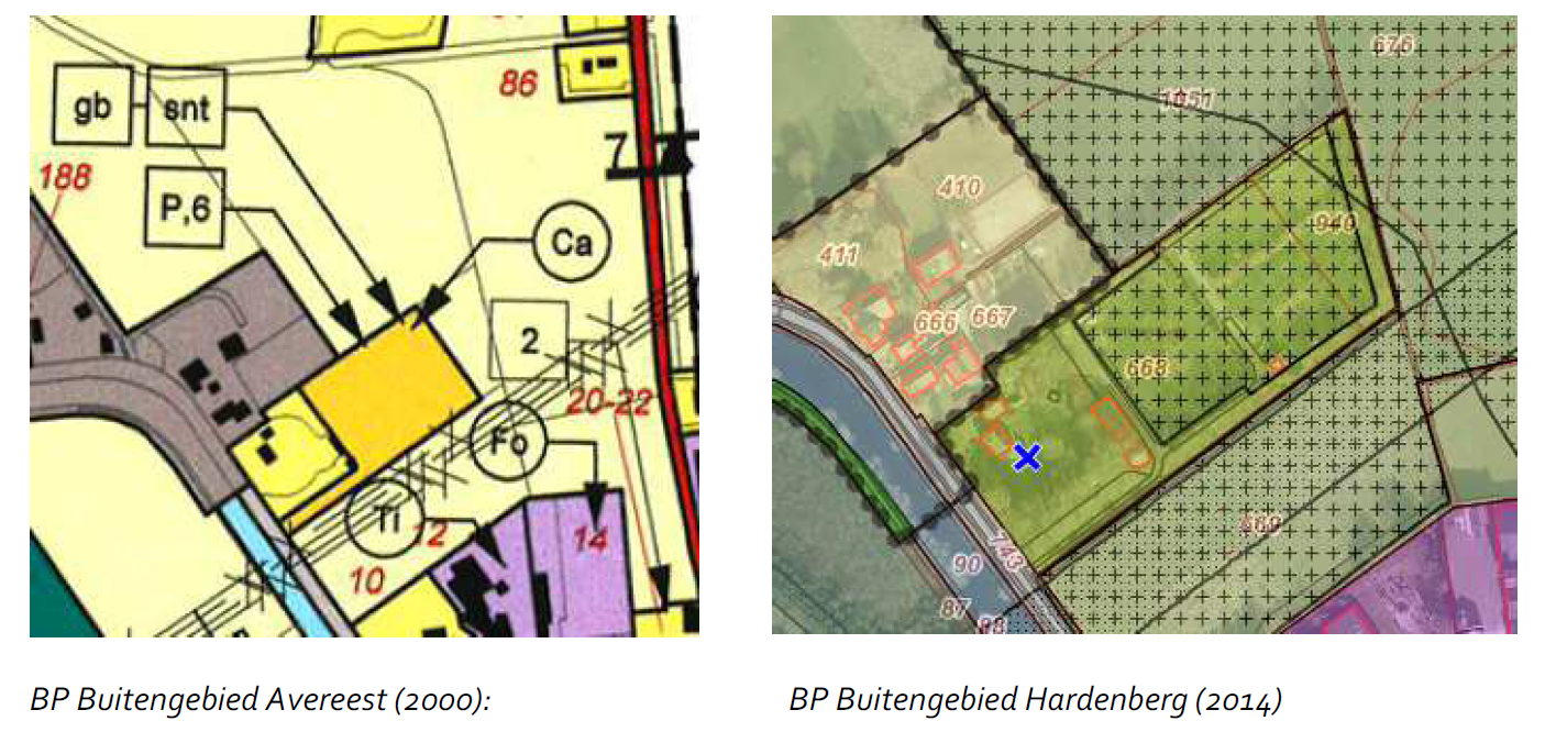 Voor het perceel gold volgens het bestemmingsplan Buitengebied Avereest (2000) een bedrijfsbestemming met de aanduiding 'paardenhouderij'. In het bestemmingsplan Buitengebied Hardenberg (2014) is aan het perceel een woonbestemming toegekend. Het bestemmingsplan Buitengebied van de voormalige gemeente Avereerst had een andere manier van bestemmen van paardenhouderijen dan de andere bestemmingsplannen buitengebieden, die zijn samengevoegd in het bestemmingsplan Buitengebied Hardenberg. Hierdoor is waarschijnlijk deze locatie over het hoofd gezien bij de omzetting naar het plan Buitengebied Hardenberg.