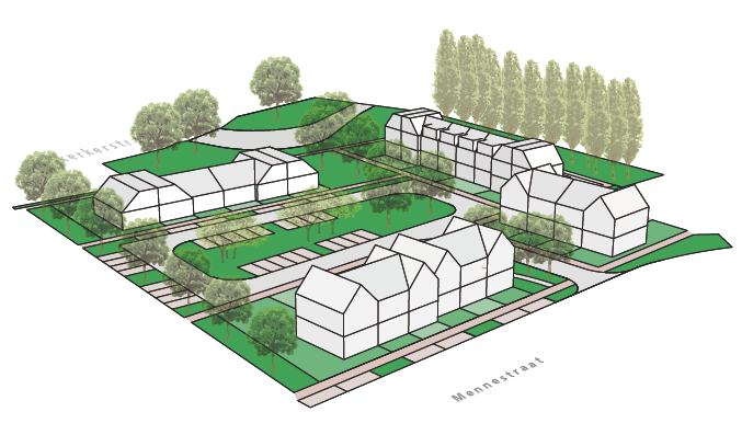 In de stedenbouwkundige opzet is uitgegaan van een centraal groen erf, waar de woningen als een hoefijzer omheen liggen. Het gebied wordt voor het autoverkeer vanaf de Mennestraat ontsloten. De rijenwoningen zijn op de Mennestraat geprojecteerd. Hiermee wordt het bestaande straatbeeld langs de Mennestraat voortgezet. De beneden- en bovenwoningen en de levensloopbestendige woningen zijn geprojecteerd rondom het groene erf.