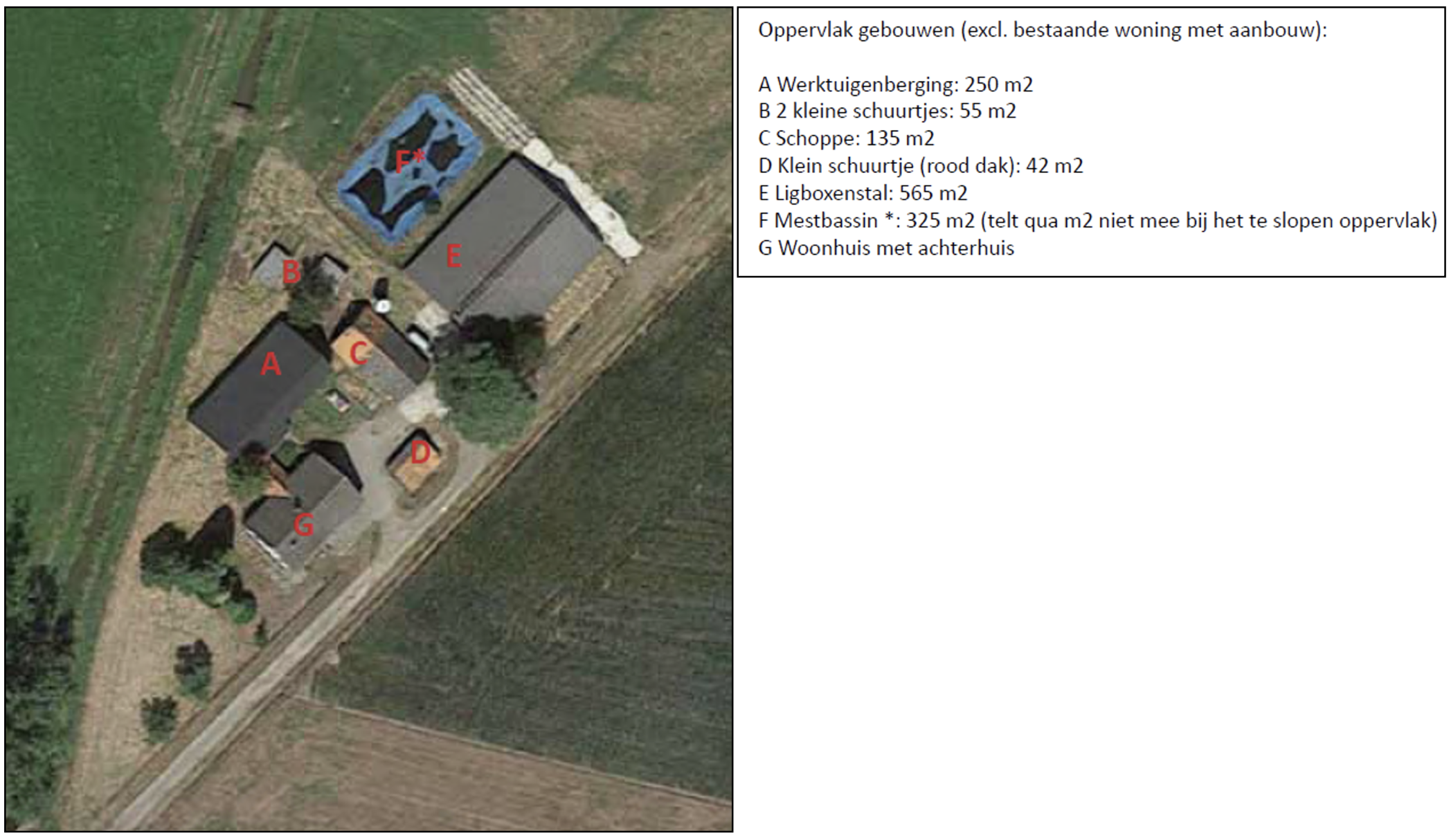 Zoals reeds is verwoord in de aanleiding zijn de bedrijfsactiviteiten beëindigd en wil initiatiefnemer het perceel uitsluitend gebruiken voor het wonen. Daarnaast bestaat het voornemen om de voormalige ligboxenstal, de werktuigenberging, drie kleine schuurtjes en een aanbouw aan de schoppe te slopen (samen ruim 900 m2, zie ook afbeelding 2.2). In ruil voor het slopen wordt een nieuwe woning met bijgebouwen gerealiseerd op het erf.