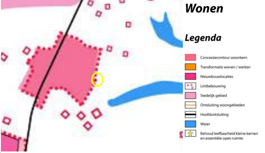 Op de kaart 'Wonen' uit de structuurvisie Wijchen ligt het plangebied op de grens van de gebieden 'concessie contour woonkern' en 'lintbebouwing'. Voor beide gebieden is geen specifiek beleid opgenomen. Voorliggend plan maakt vier woningen mogelijk op een locatie die in de bestaande situatie al een woonfunctie heeft. Hierdoor, en doordat het plangebied gelegen is in een woongebied, is het initiatief goed passend. In navolgende subparagraaf wordt nader ingegaan op de kwantitatieve- en kwalitatieve inpassing van de woningen in het gemeentelijk woningbouwbeleid. Navolgende afbeelding toont een uitsnede van de kaart 'Wonen' uit de structuurvisie.
