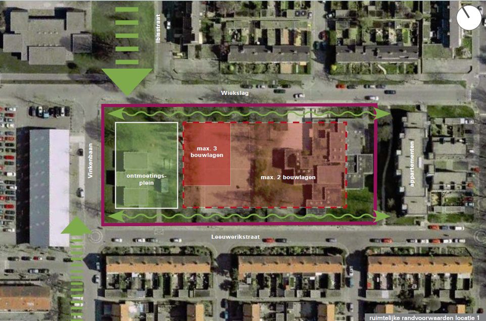 De locatie voor de nieuwe ABC school ligt in de groene voorzieningenzone langs de Wiekslag. De Wiekslag is een belangrijke straat op de schaal van de wijk, laanbeplanting in een groene berm versterkt deze functie. De Leeuwerikstraat langs de zuidzijde van de locatie is veel meer een informele woonstraat. Direct grenzend aan het plangebied (oostzijde) staat een appartementengebouw van vier lagen hoog met daarachter twee bouwblokken met rijwoningen van drie lagen hoog. Het appartementengebouw heeft aan de zijde van het plangebied een eigen tuin.
