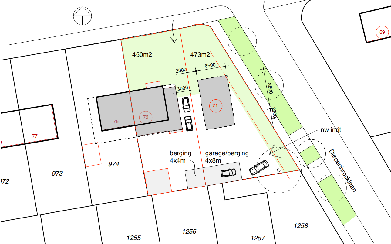 Zoals gezegd is het de bedoeling een deel van het bestaande perceel Drakenburgerweg 73 af te splitsen, zodanig, dat op het afgesplitste gedeelte een vrijstaande woning gerealiseerd kan worden. Hiervoor is het nodig de bestaande garage/ berging te slopen en daarvoor in de plaats een nieuwe garage/ berging te realiseren op het achtererf. Opgemerkt kan worden, dat de nieuwe garage/ berging aanzienlijk kleiner is dan de huidige, waardoor deze nieuwbouw minder opvallend zal ogen. De nieuwe garage wordt ontsloten vanaf de Diepenbrocklaan, waarbij er voor gezorgd zal worden, dat de bestaande forse eik als beeldbepalende boom ongehinderd kan blijven bestaan.