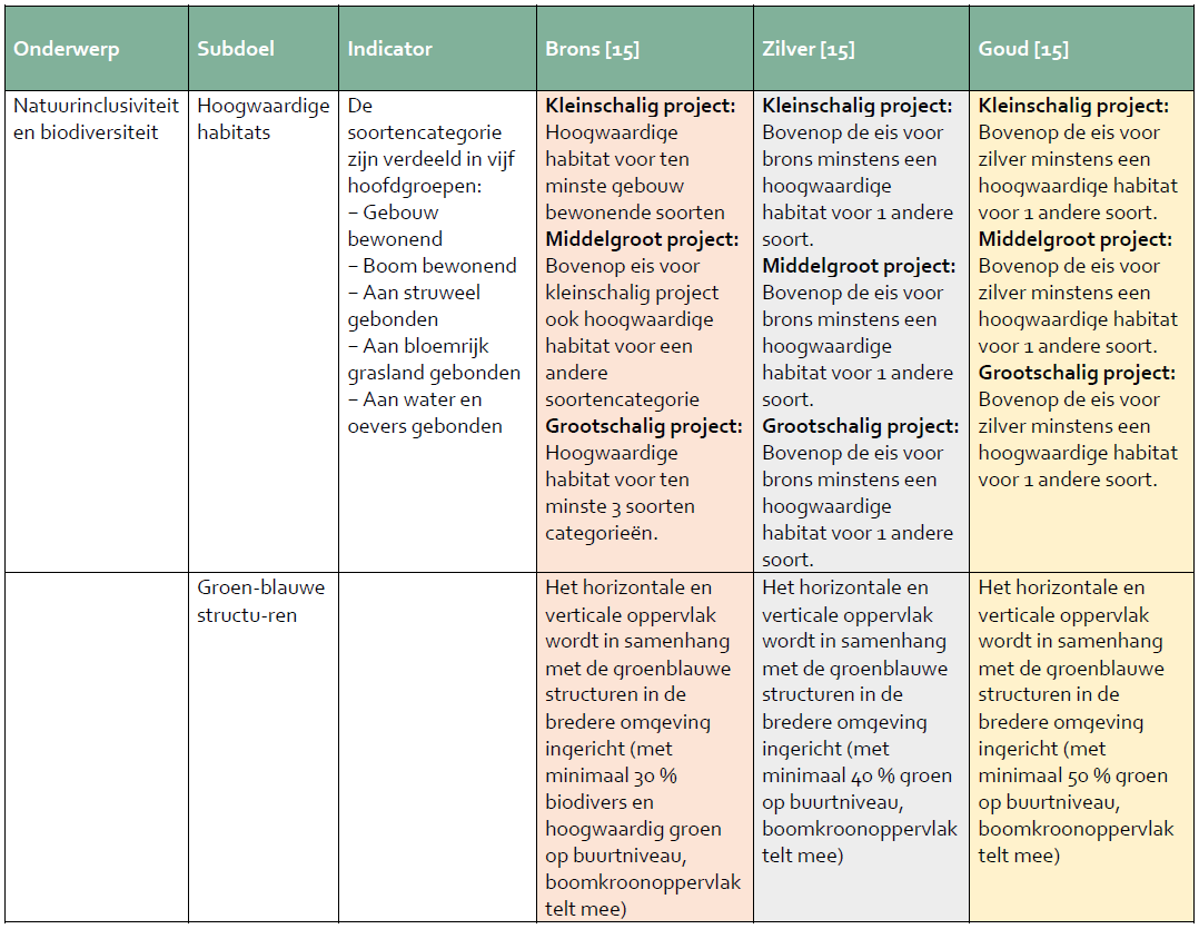 In het Convenant is een "Toetsingskader" opgenomen, waarin voor de verschillende duurzaamheidsaspecten aangegeven is welke eisen er gelden voor het ambitienieveau "brons", "zilver", of "goud". Het toetsingskader is hieronder opgenomen: