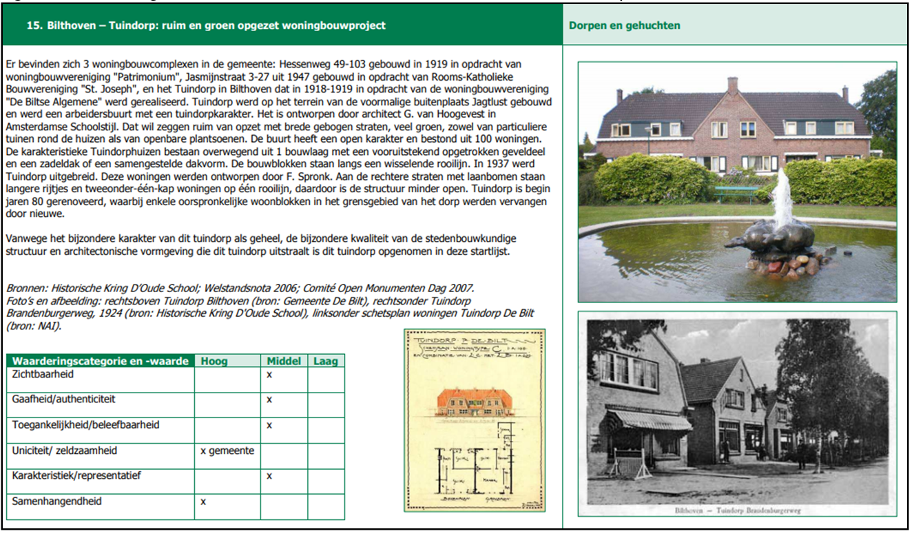 Het plangebied en omgeving kan worden omschreven als een gedifferentieerd gebied in het midden van Bilthoven. Omdat de woningen in deze omgeving in een tijdsbestek van een kleine honderd jaar zijn gerealiseerd, is er een gedifferentieerde ruimtelijke bebouwingskarakteristiek ontstaan. Het meest kenmerkende verschil tussen de woongebieden zit in de stedenbouwkundige eigenschappen. In het gebied loopt de bebouwing sterk uiteen. In het noordoosten is een ruime opzet aangehouden met grote kavels en al dan niet vrijstaande villa’s en wordt het zuidwesten gekenmerkt door kleine eengezinshuizen op relatief grote kavels.