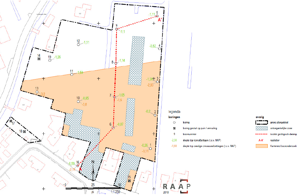 Indien diepere ingrepen dan circa 1 m -Mv (0 m +NAP) plaatsvinden, bijvoorbeeld door onderkeldering van huizen, dan wordt het potentieel archeologisch niveau wel bereikt. Geadviseerd wordt dan het zuidelijke deel van deelgebied A (zie figuur 5.7), oranje deel) te onderzoeken om vast te stellen of er daadwerkelijk archeologische resten aanwezig zijn.
