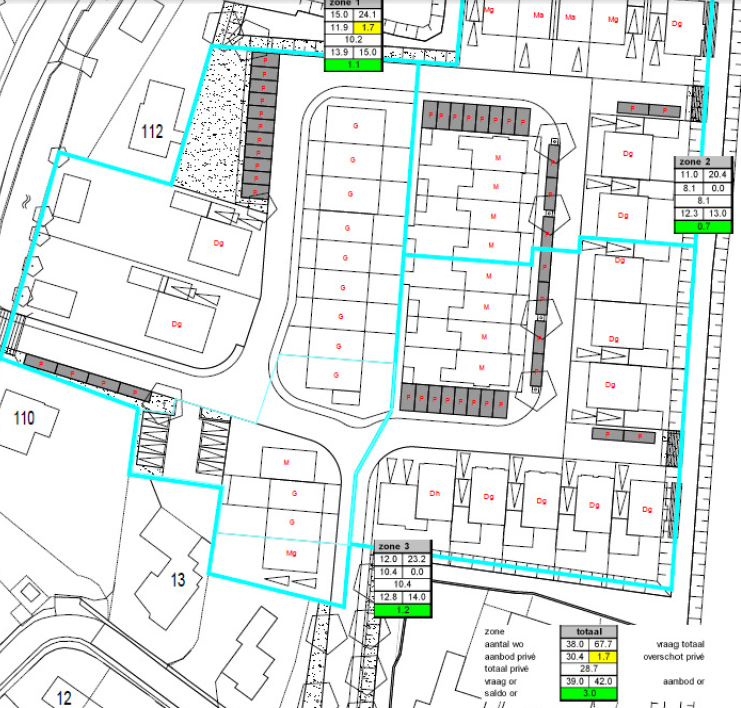 Omdat een garage zelden als autostalling wordt gebruikt, wordt deze niet meegeteld in de normering. Ook voor de opstelmogelijkheden op eigen terrein gelden verschillende verdelingen van de parkeernorm afhankelijk van de situering van de opstelplaatsen en de lengte van de oprit. In de openbare ruimte wordt minimaal 0,3 parkeerplaatsen voor bezoekers gerealiseerd.