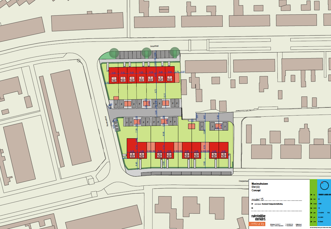 Het nieuwbouwplan voorziet in de ontwikkeling van maximaal 15 grondgebonden woningen langs de Irenestraat en de Oranjestraat. Er kunnen vrijstaande woningen, twee-onder-één-kapwoningen en rijwoningen worden gerealiseerd. De maximum bebouwingshoogte van de woningen is twee lagen met een kap. Deze kap heeft, confom het programma van eisen in 3.3.5, een nokrichting parallel aan de straat. De woningen worden met hun voorkanten en voortuinen langs de straten geplaatst en krijgen net als de bestaande woningen diepe tuinen. Ook wordt het element van de achterstraten overgenomen in een parkeerstraat aan de achterzijde van de woningen. Ter begeleiding van de Nassaustraat en verbijzondering van de koppen richting deze straat is de mogelijkheid opgenomen aan deze zijde een aanbouw te realiseren. De afstand tot de zijdelingse perceelgrenzen is minimaal 2,5 m, uitgezonderd ter hoogte van de inrit naar de achterstraat in de Oranjestraat. Hier wordt 2m mogelijk geacht, omdat het een ondergeschikte straat is die niet openbaar is. Op navolgende afbeelding is een voorbeelduitwerking van het plan te zien.