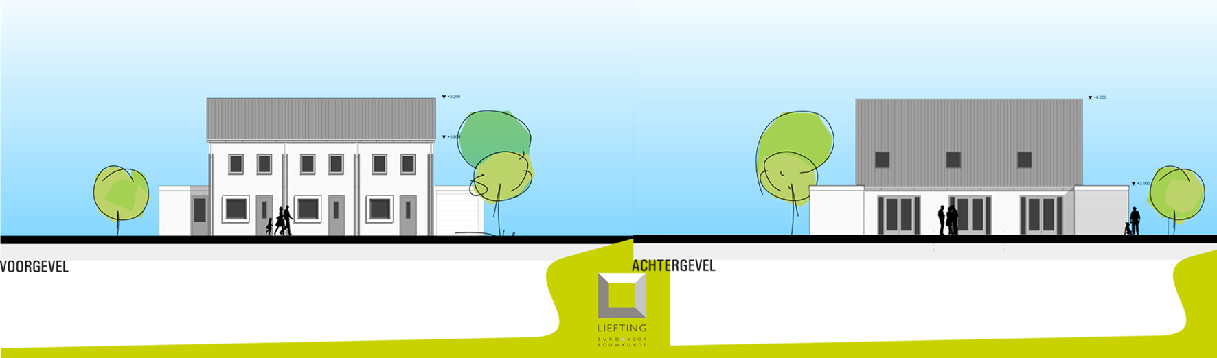 De nieuwe woningen bestaan uit vier aaneengebouwde woningen, een drie-onder-één kapwoning en een twee-onder-één kapwoning.