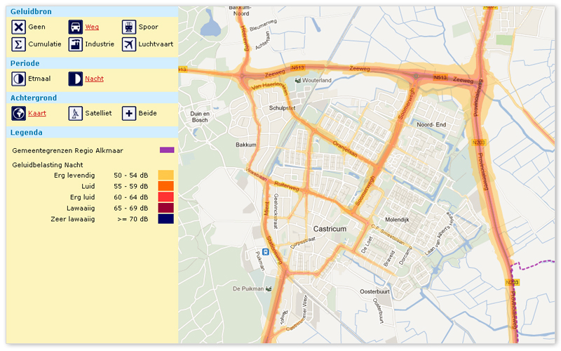 Op de geluidsbelastingkaart van de Milieudienst Regio Alkmaar zijn de geluidscontouren opgenomen van onder andere spoor- en wegverkeerslawaai. De contouren op deze kaarten zijn lijnen van gelijke geluidsbelastingen die zijn berekend op basis van actuele verkeersgegevens en een computermodel.