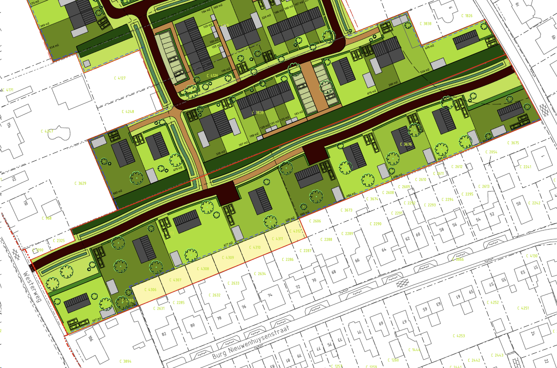 Het groen in de buurten domineert het wegbeeld, de auto is zo veel mogelijk buiten beeld. De wegprofielen zijn minimaal, de openbare ruimte is beperkt, waardoor de kavels zo groot mogelijk kunnen zijn. Bomen staan vooral in voortuinen. De wegen hebben een bochtig verloop. Doordat het bestaande groen wordt ingepast, is op een groot aantal plaatsen al volwassen groen aanwezig. Om het groen verder te versterken in de buurten, worden in de buurten enkele nieuwe groene elementen opgenomen: speelveldjes, bosjes, boomgaarden e.d. Tussen de buurten liggen smalle paadjes die de buurten en de groene plekken met elkaar verbinden. Elke buurt heeft een mix van woningen en de woningen worden zoveel mogelijk willekeurig over de buurten en langs de wegen verdeeld. Woningen worden gebouwd in een rij van maximaal 5, maar liever 4. In principe worden rijwoningen niet direct naast elkaar of tegenover elkaar gebouwd. Om het willekeurige karakter te versterken, hebben woningen verspringende rooilijnen. Het parkeren gebeurt op eigen erf (in elk geval bij vrijstaande woningen en twee-onder-één-kap woningen), in parkeerkoffers tussen de tuinen of haaks op de rijbaan. Ter illustratie is in figuur 2.3 een plattegrond opgenomen van het wensbeeld.