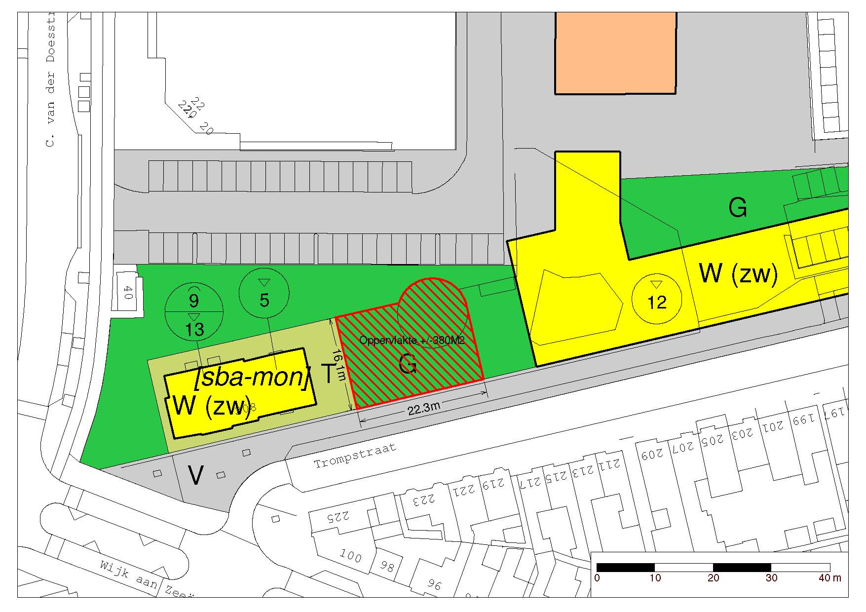 De huidige twee speelplekken zijn gezamenlijk circa 300 m2 groot. Deze oppervlakte wordt ook in de nieuwe situatie gebruikt om de speelplaatsen terug te plaasten. Ter illustratie is in onderstaande afbeelding een oppervlakte van 380 m2 weergegeven. Op dit moment is nog niet duidelijk hoe de nieuwe speelplekken vorm worden gegeven; het is mogelijk dat deze ook buiten het gearceerde deel geplaatst kunnen worden, bijvoorbeeld meer in westelijke richting, noordelijk van Trompstraat 208. Inrichting van de speelplek zal in afstemming met bewoners worden gedaan. Conclusie: Het bestemmingsplan wordt niet aangepast.