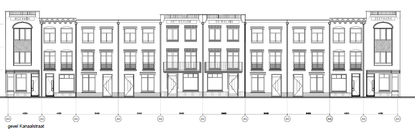 In figuren 3.3 en 3.4 (afkomstig uit het voorlopig ontwerp) is te zien dat er, conform het RFK, wordt uitgegaan van een pandsgewijze indeling per straatwand. De gevelpartijen van de verschillende panden worden individueel vormgegeven met kappen en platte daken waardoor een gevarieerd straatbeeld ontstaat zonder dat er sprake is van een herhalende ritmiek van entree- en raampartijen in de gevel.