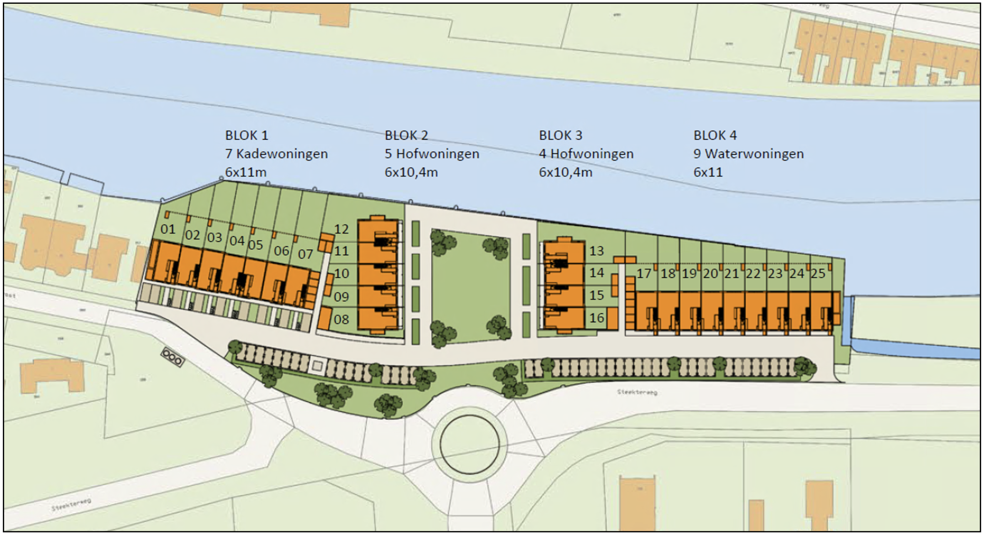 Twee van de vier woonblokken zijn georiënteerd op de Steekterweg, in lijn met de woningen van het bestaande bebouwingslint langs de Gouwestraat, direct ten westen van de locatie. De andere twee blokken zijn gericht op een de openbare groenvoorziening, in vorm van een grasveld/parkplein met verblijfsruimtes voor bewoners en bezoekers. Deze openbare ruimte wordt ingericht met groen en zitmogelijkheden zodat er een ontmoetingsplek voor bewoners ontstaat met vrij uitzicht op de Oude Rijn. Dit grasveld/parkplein staat in verbinding met de ontsluitingsweg die over de gehele lengte van het plangebied wordt aangelegd, parallel aan de Steekterweg. Langs deze ontsluitingsweg komen voldoende haakse parkeerplaatsen om binnen het plangebied te voldoen aan de parkeernorm. Vanaf de Steekterweg is er door de onderbreking van het bebouwingslint een zichtlijn op de rivier.