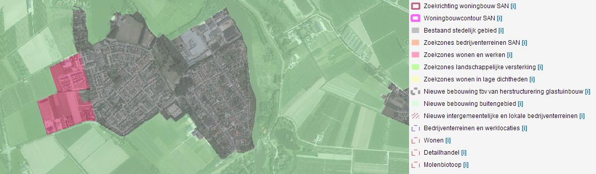 Nieuwe bebouwing ten behoeve van wonen en werken is slechts toegestaan binnen bestaand bebouwd gebied en binnen de zoekzones wonen en werken (Streekplan). Op de voorgaande afbeelding zijn deze gebieden weergegeven. De planlocatie valt binnen bestaand stedelijk gebied. Nieuwe ontwikkelingen ten behoeve van wonen en werken zijn daarmee toegestaan.