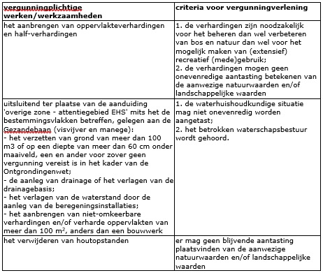 het aanbrengen van oppervlakteverhardingen en half-verhardingen groter dan 100 m2 | 1. de verhardingen zijn noodzakelijk voor het beheren dan wel verbeteren van gronden dan wel voor het mogelijk maken van extensief recreatief medegebruik; 2. de verhardingen mogen geen onevenredige aantasting betekenen van de aanwezige natuurwaarden |