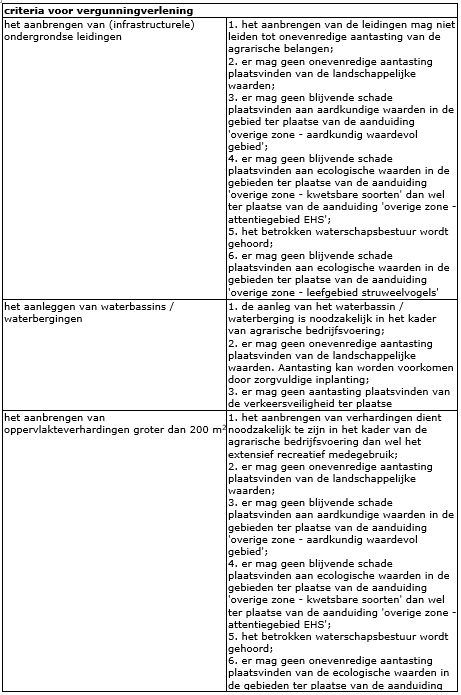het aanbrengen van (infrastructurele) ondergrondse leidingen | 1. het aanbrengen van de leidingen mag niet leiden tot onevenredige aantasting van de agrarische belangen; 2. er mag geen onevenredige aantasting plaatsvinden van de landschappelijke waarden |