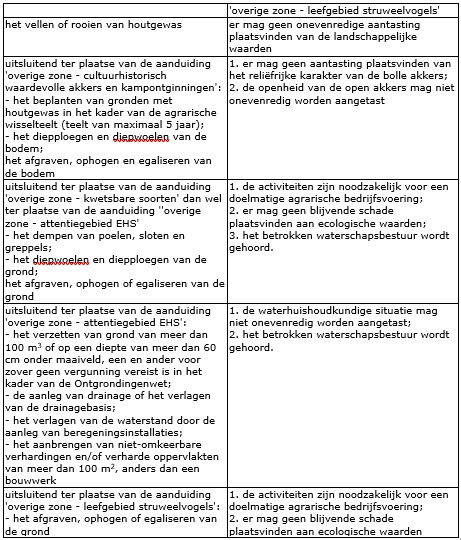 het graven, ophogen en egaliseren van de bodem | 1. deze werkzaamheden vinden plaats in het kader van het bos- en natuurbeheer; 2. de werkzaamheden mogen niet leiden tot een onevenredige aantasting van het reliëf |