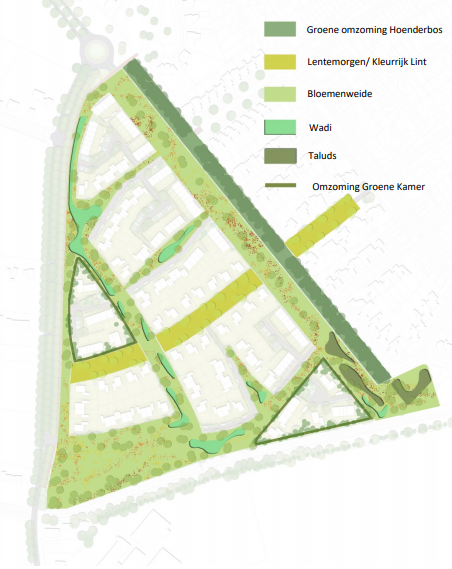 Het groene karakter van de wijk wordt gewaarborgd door de toepassing van robuuste groenstructuren die de wijk dooraderen en verbinden met de omringende gebieden. De robuuste maatvoering van de groengebieden is niet alleen belangrijk voor de sfeer van de wijk maar ook voor het creëren van retentievoorzieningen voor water. De groenzones bieden tevens ruimte aan spel en bewegen.