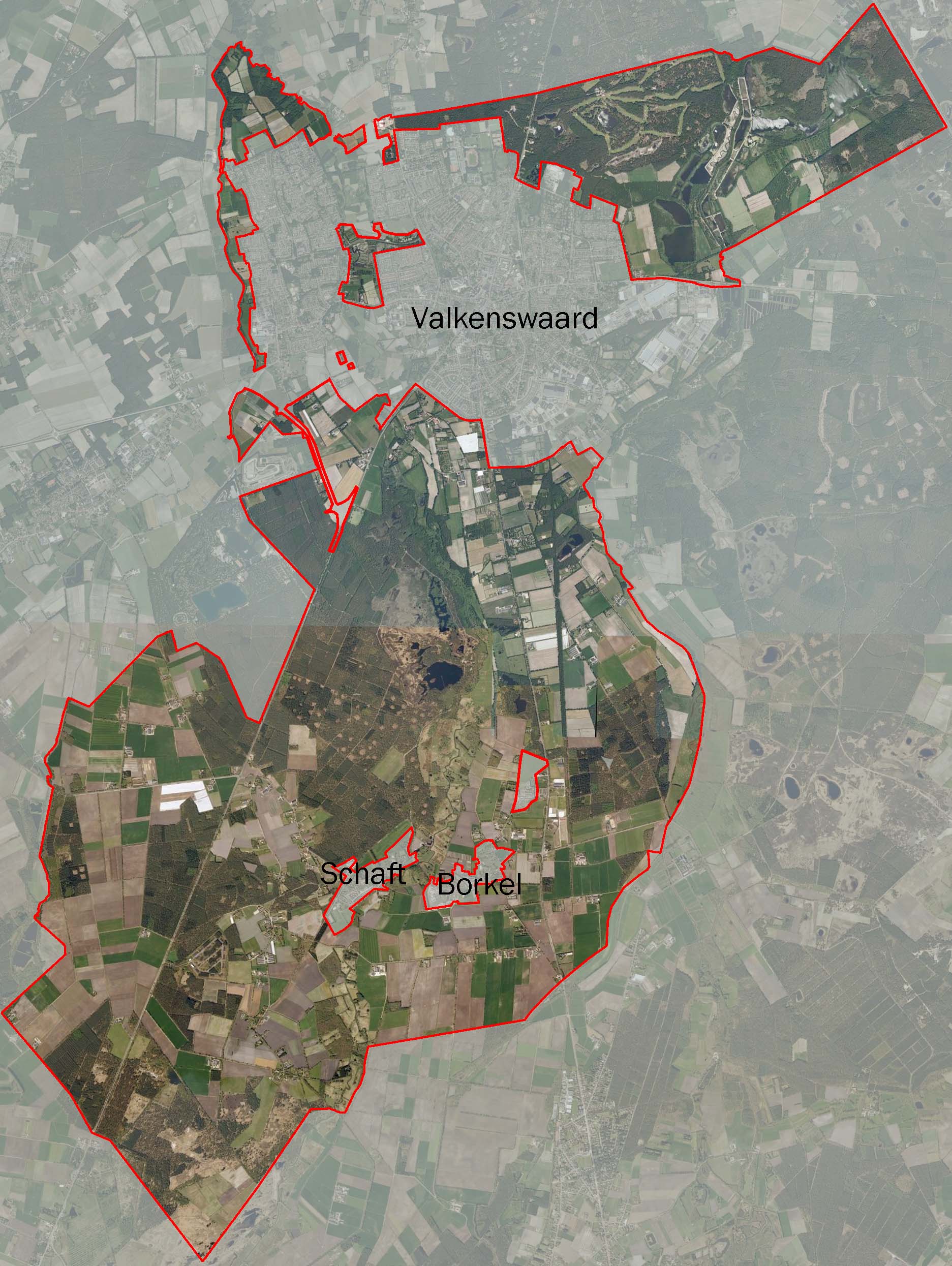 Het plangebied beslaat nagenoeg het gehele grondgebied van de gemeente Valkenswaard, met uitzondering van de dorpskernen. Op de hierna volgende afbeelding is de begrenzing van het plangebied weergegeven. De gemeente grenst aan verschillende gemeenten: