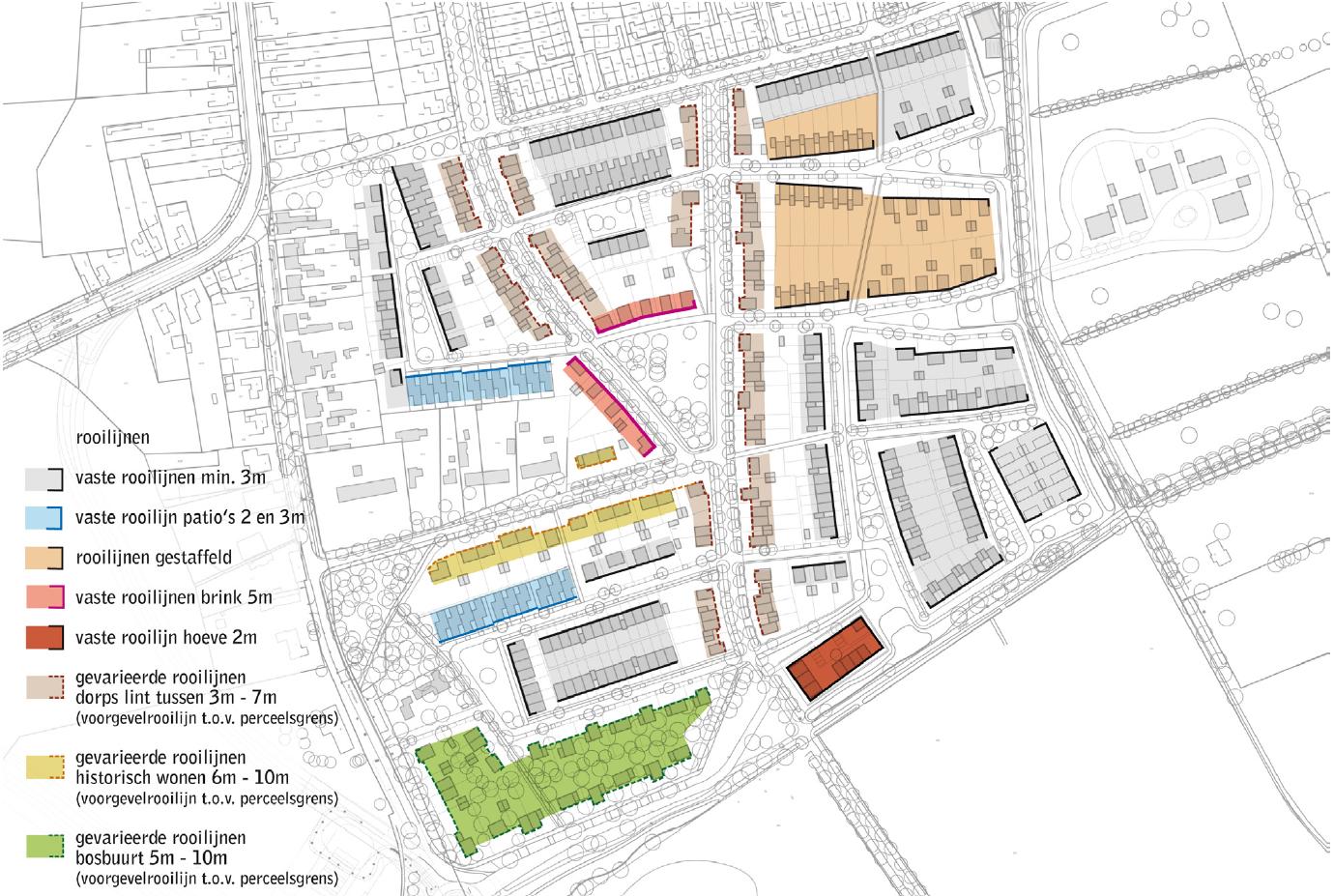 Door het spel met de voorgevelrooilijnen wordt bijgedragen aan de gewenste variatie of rust in het straatbeeld. In het stedenbouwkundige plan is een indicatie van de gewenste rooilijnen aangeduid, opgebouwd uit vaste rooilijnen, variatie in rooilijnen en minimale rooilijnen.