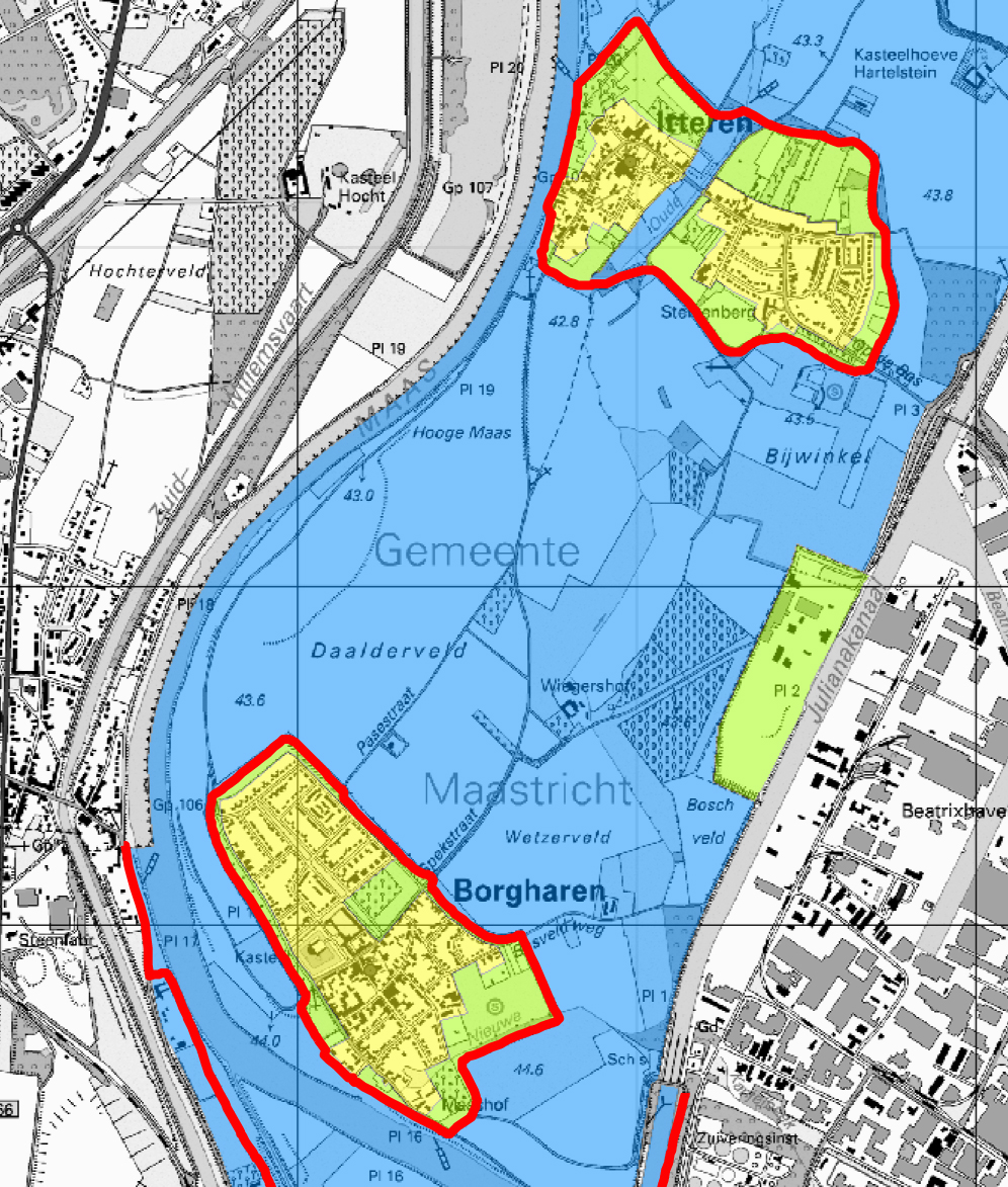 Het voorliggend plangebied is geheel gelegen in het rivierbed van de Maas. De kern Borgharen omvat gebieden die zijn aangewezen als waterbergend rivierbed en gebieden die zijn vrijgesteld van de vergunningplicht voor het gebruik van waterstaatswerken (gebieden Wet beheer rijkswaterstaatwerken art. 2a). De vrijgestelde gebieden betreffen de hoofdzakelijk bebouwde gebieden. Itteren omvat eveneens gebieden die zijn aangewezen als waterbergend rivierbed en gebieden die zijn vrijgesteld van de vergunningplicht voor het gebruik van waterstaatswerken. Daarnaast is het gebied rondom het tracé van de Oude Kanjelbeek aangewezen als stroomvoerend rivierbed.