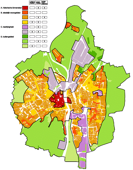 - in het woonbeleid wordt een verkleuring naar stedelijke woonmilieus voorzien in de buurten grenzend aan de binnenstad. Deze verkleuring kan gepaard gaan met een toename van gestapelde woningbouw. Maar voor de differentiatie is het ook voor deze buurten van belang dat er grondgebonden woningen aanwezig zijn.