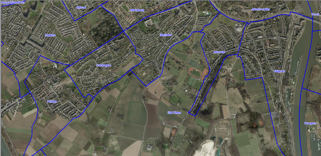 Ook de verblijfsgebieden zijn in het Beleidsplan Verkeersveiligheidvastgelegd. Het betreft alle 30 km/uurgebieden in Maastricht. Voor het plangebied betreft het de 30 km/uurgebieden in Wolder, Biesland, Villapark en Sint Pieter. Deze wegen (op de navolgende afbeelding in de gele kleur afgebeeld) zullen samen met de overige niet-ontsluitingswegen worden bestemd tot 'Verkeer - Verblijfsgebied'. Met toepassing van deze bestemming wordt het verblijfskarakter van de wegen ook juridisch verankerd.