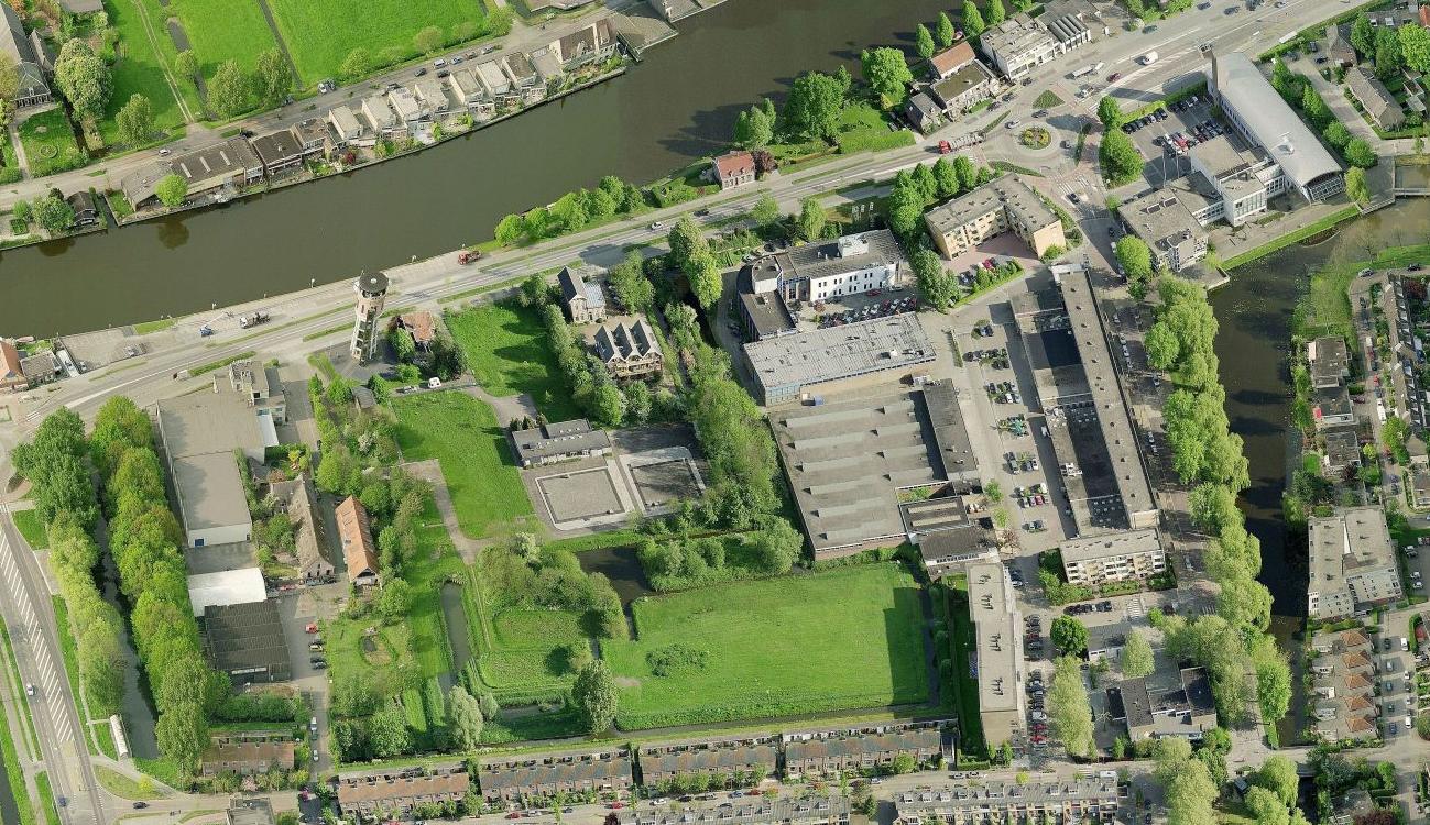 Het plangebied wordt globaal gezien begrensd door de Rijndijk, de Da Costasingel, de Potgieterlaan en de Gemeneweg. Binnen deze wegen komt de meeste bebouwing voor. Naast verschillende bedrijven is met name aan de randen van het plangebied de woonfunctie aanwezig. Aan de rotonde in het noordoosten van het plangebied is een appartementengebouw bestaande uit 4 bouwlagen aanwezig. Daarnaast zijn boven verschillende kleine winkeltjes 2 lagen appartementen aanwezig. Rondom de basisschool in de zuidoosthoek van het plangebied zijn een tweetal kleine flatgebouwen aanwezig, bestaande uit 4 respectievelijk 5 bouwlagen. Daarnaast zijn in het zuiden van het plangebied, aan de Potgieterlaan, rijtjeswoningen aanwezig. Een opvallend gebouw in het plangebied is de watertoren in het noorden van het plangebied.