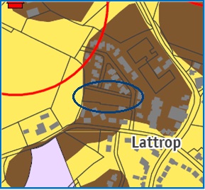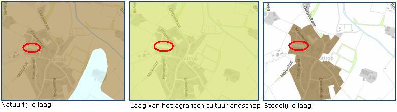 In figuur 3.2 zijn de eerste drie lagen weergegeven, waarbij het plangebied rood omcirkeld is. Binnen de lust- en leisurelaag heeft het gehele dorp Lattrop, dus ook het plangebied, de aanduiding donkerte. Het is hierom dat deze laag niet is weergegeven.