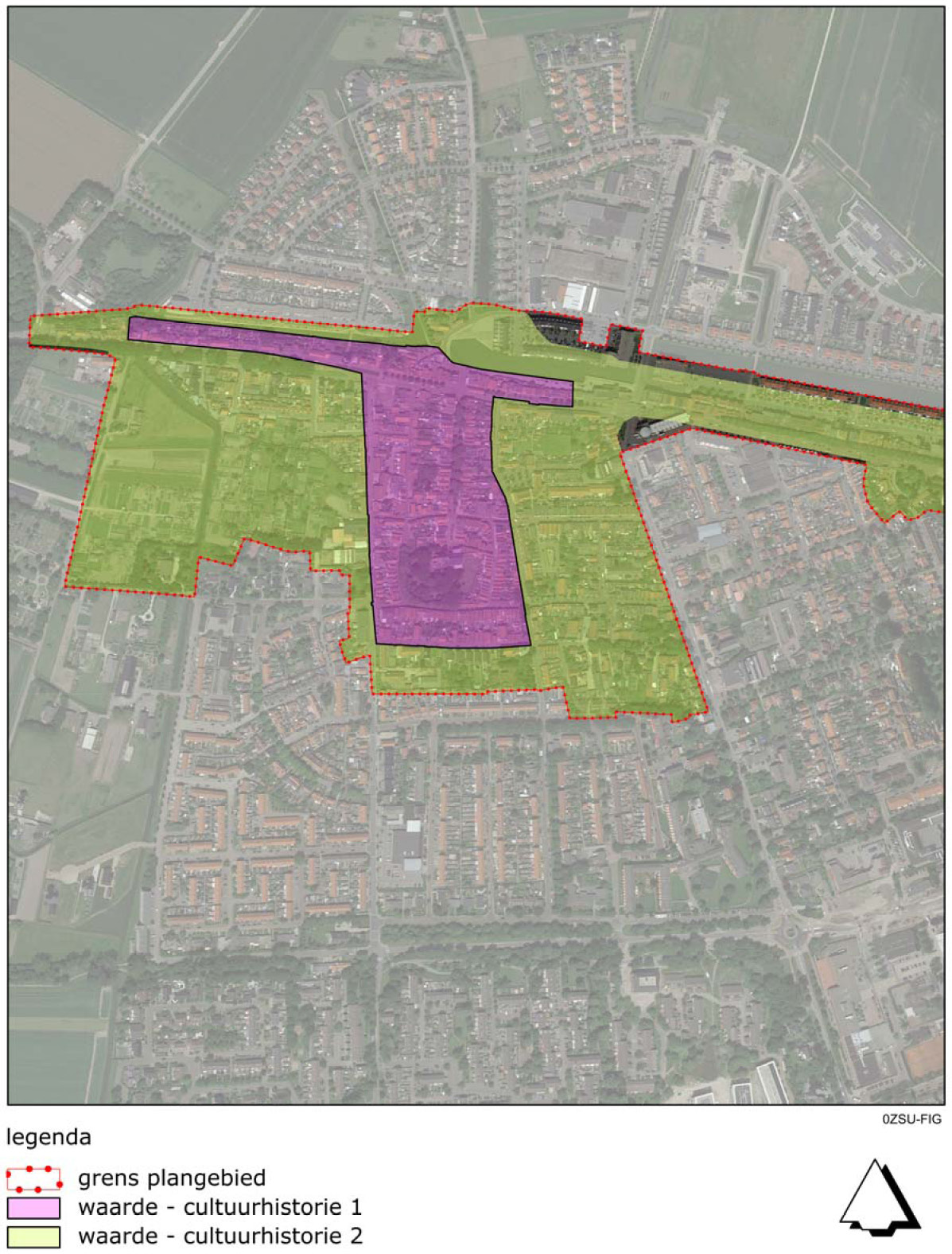 Het patroon van straten, dijken, waterlopen, open ruimten en bebouwing is vastgelegd door middel van directe bestemmingen en bouwvlakken met bijbehorende gebruiks- en bouwregels. Daarnaast is voor de gehele beschermde stads- en dorpsgezichten een dubbelbestemming 'Waarde - Cultuurhistorie' opgenomen, met aanvullende regels. Aan het historische kerngebied, zoals weergegeven in figuren 4.4 t/m 4.6, is de dubbelbestemming 'Waarde - Cultuurhistorie 1' toegekend. Hier geldt een strikt beschermingsregime voor zowel bebouwing als openbare ruimte. De overige delen hebben de dubbelbestemming 'Waarde - Cultuurhistorie 2' gekregen. Hier gelden minder beperkingen. Op de volgende karakteristieke plekken binnen het gebied met de dubbelbestemming 'Waarde - Cultuurhistorie 2' is voor veranderingen in de openbare ruimte een nadere afweging (via omgevingsvergunning) nodig: