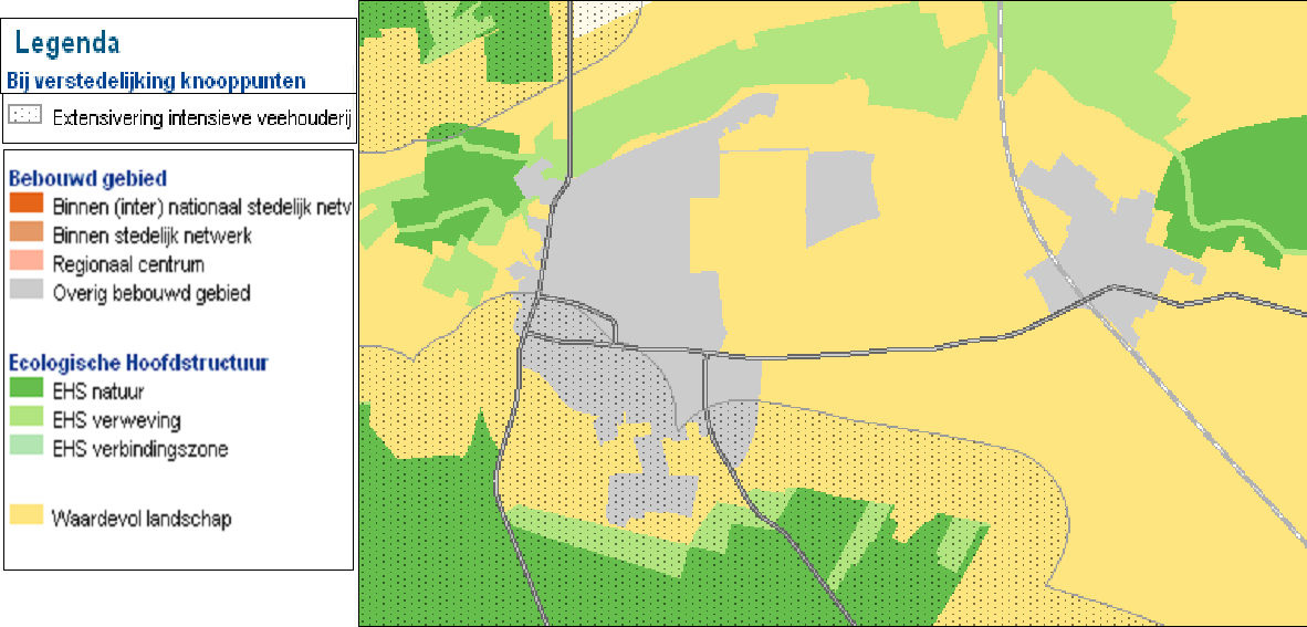 Op de beleidskaart Ruimtelijke Structuur is ten zuiden van het plangebied een zone aangegeven als extensivering intensieve veehouderij, welke is gebaseerd op het reconstructieplan. Hier is onder andere nieuwvestiging, hervestiging en omschakeling naar intensieve veehouderij niet toegestaan.