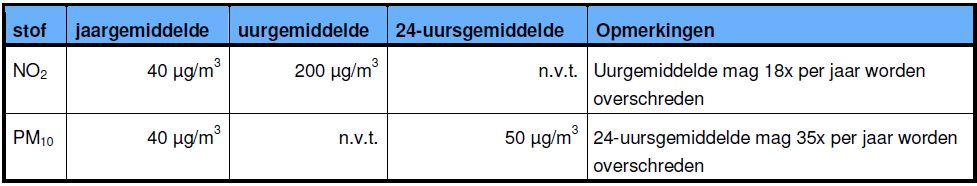 In 2011 moet aan de grenswaarden (jaargemiddelde en 24-uursgemiddelde concentratie) voor PM10 worden voldaan. Voor NO2 geldt dat vanaf 2015 moet worden voldaan aan de (jaargemiddelde en uurgemiddelde) grenswaarden. Tot deze grenswaarden gelden zijn minder strenge grenswaarden van kracht.