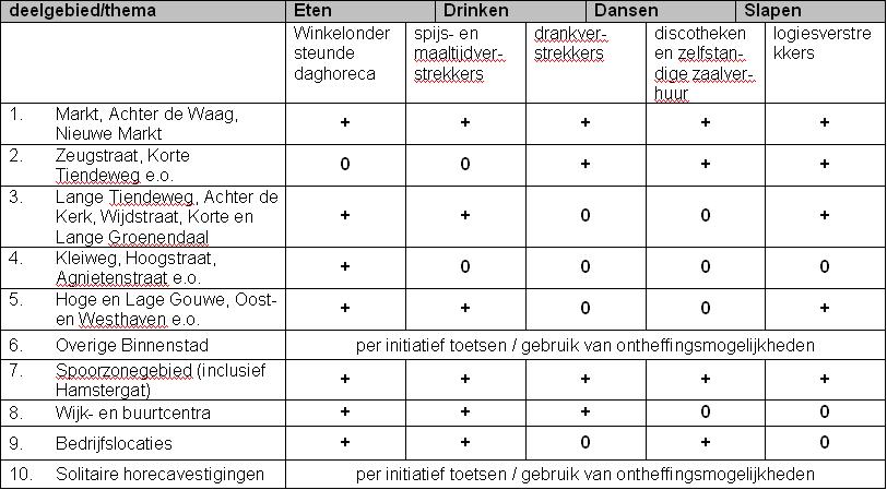Voor elk van de 10 in de horecanota genoemde deelgebieden, welke ieder een eigen gebiedsprofiel hebben, is aangegeven welke horecacategorie gewenst is en eventueel ontwikkeld mag worden. Ook is aangegeven voor welke horecacategorieën een consoliderend beleid geldt.