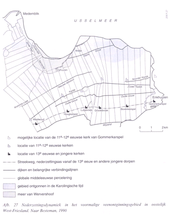 Vanaf de Merovingische Tijd is een deel van de Kop van Noord-Holland weer bewoond en dus ontgonnen. De eerste veenontginningen zijn vanuit de oude nederzettingen op de oude duinen aangevangen. Zo werd Scharwoude (Schoorlwoude) ontgonnen vanuit Schoorl. Maar ook vanaf Medemblik aan de oostelijke rand van het grote veengebied zijn ontginningen begonnen. De oudste Karolingische nederzettingen ten zuiden van Medemblik maakten waarschijnlijk nog geen gebruik van een parallel afwateringssysteem. In de tiende tot twaalfde eeuw waren zij wel het uitgangspunt voor een grootschalige zuidwaartse ontginning, waarbij het gehele gebied werd ontwaterd door middel van een grootschalig systeem van parallelle noord-zuid verlopende sloten. De nederzettingen, die in de voorgaande periode verspreid lagen, concentreerden zich nu langs de nieuwe grens, de Kadijk, waar sporen van de elfde - twaalfde-eeuwse kerkjes of kerkhoven zijn teruggevonden. In de dertiende eeuw schoof de bewoning weer naar het zuiden op en concentreerde zich op een lijn ter plaatse van de huidige dorpenreeks langs de Streekweg. Het opschuiven van de bewoning had te maken met het feit, dat door de ontwatering het volume van het veen afnam en zich daarnaast een proces van oxidatie van het veen voltrok.