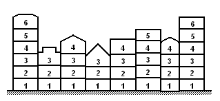 Figuur boven: Theoretische berekening van de (maximale) gemiddelde bouwhoogte voor bebouwingsstrook VI op de plankaart (minimaal 3 bouwlagen, maximaal 6 bouwlagen). De 8 panden hebben bij elkaar opgeteld 35 bouwlagen. De gemiddelde bouwhoogte is 4.375 bouwlagen (35 gedeeld door 8). Dit aantal blijft onder de maximale gemiddelde bouwhoogte van 4.5 bouwlagen en voldoet daarmee aan het bouwvoorschrift voor bebouwingsstrook VI.